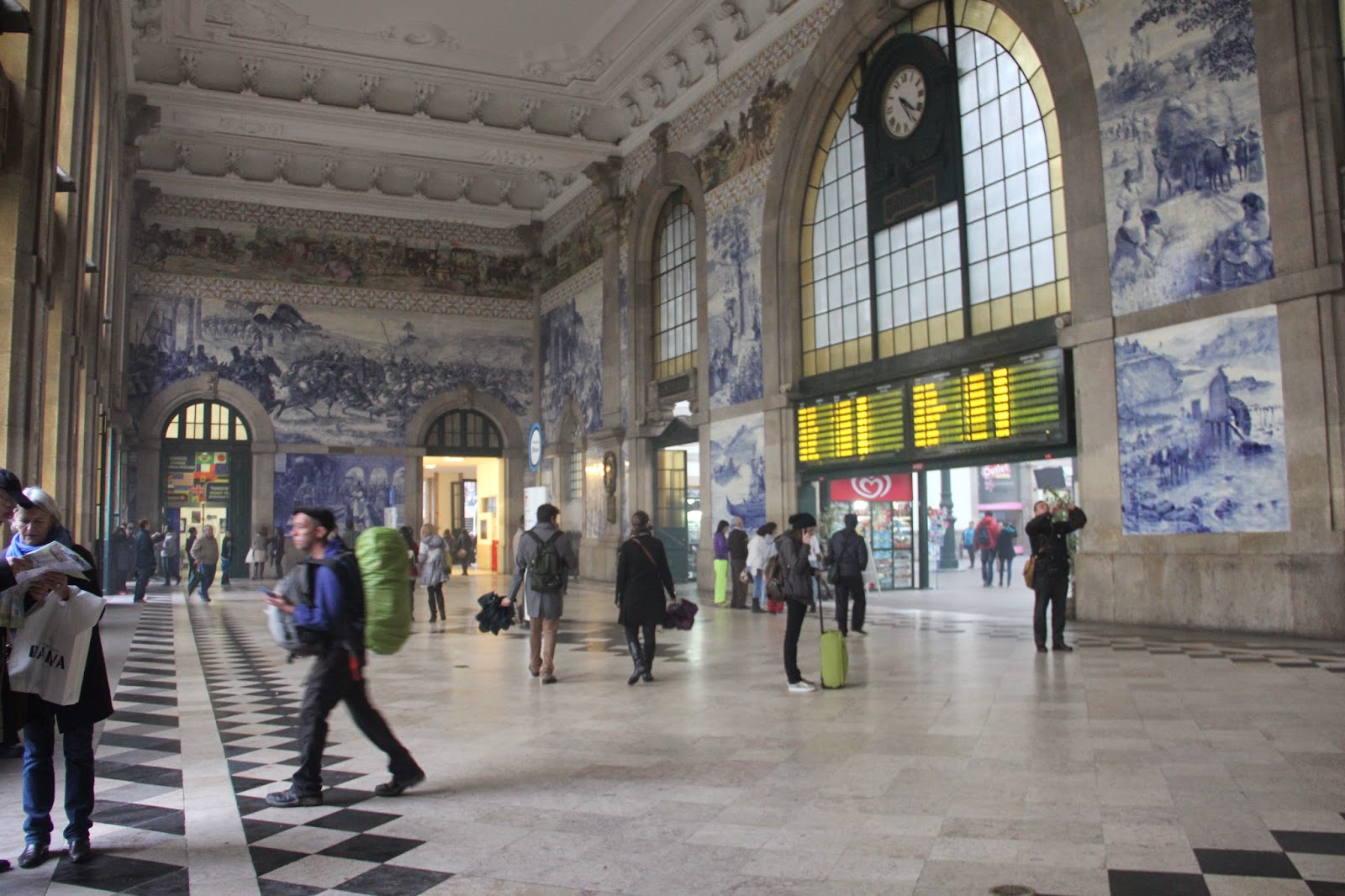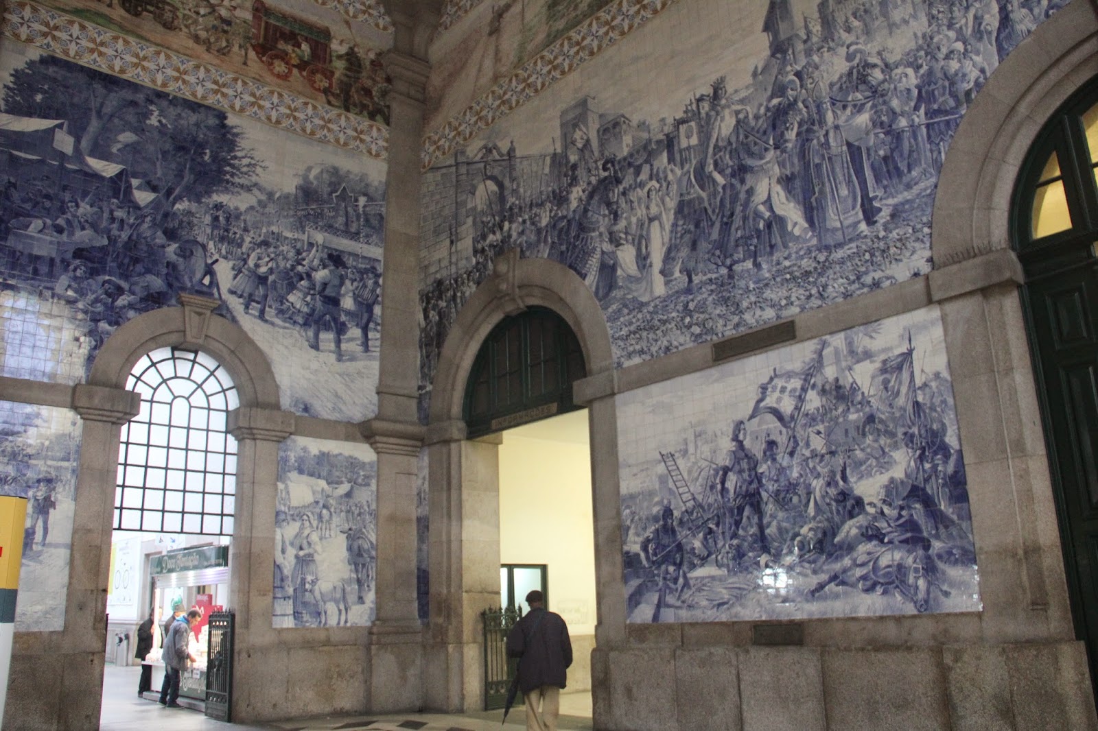 駅構内はの写真のように一面が、20世紀初期の美しいazulejoの絵で被われている。